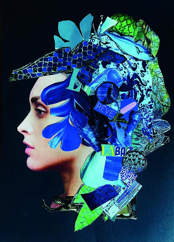 Visages sur fond noir, mots glissés comme des pensées échappées ou des voix intérieures, des matières visuelles comme des textures poétiques : chaque œuvre dévoile une identité fragmentée, entre rêve, mémoire et imaginaire. Les collages assemblent images, motifs, couleurs et textes, comme autant de